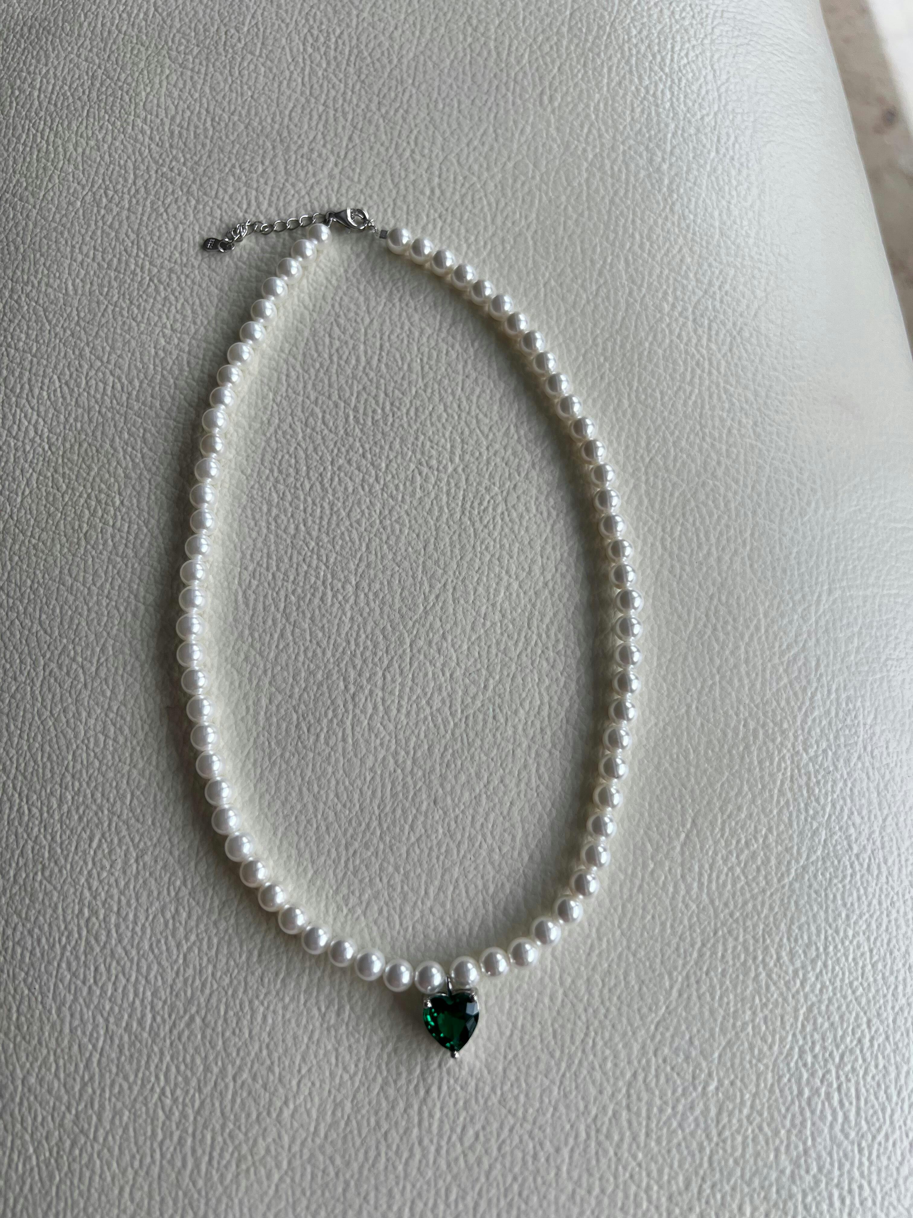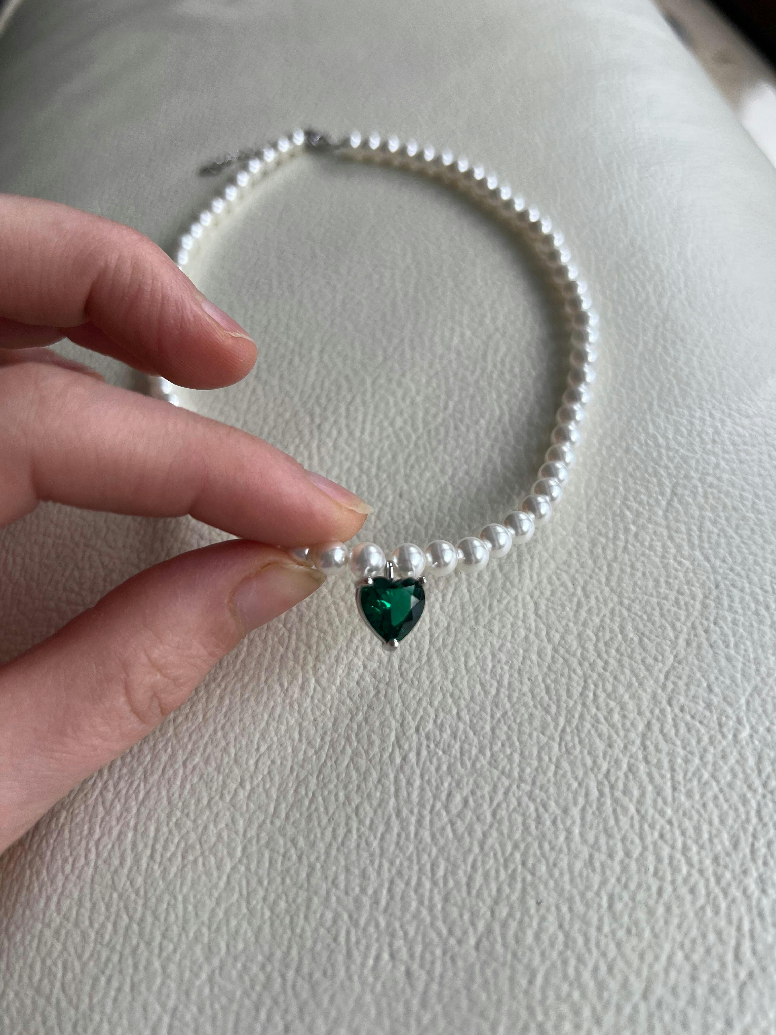 Freshwater pearl necklace, 925 sterling silver, green heart, cubic zirconia | Loviya